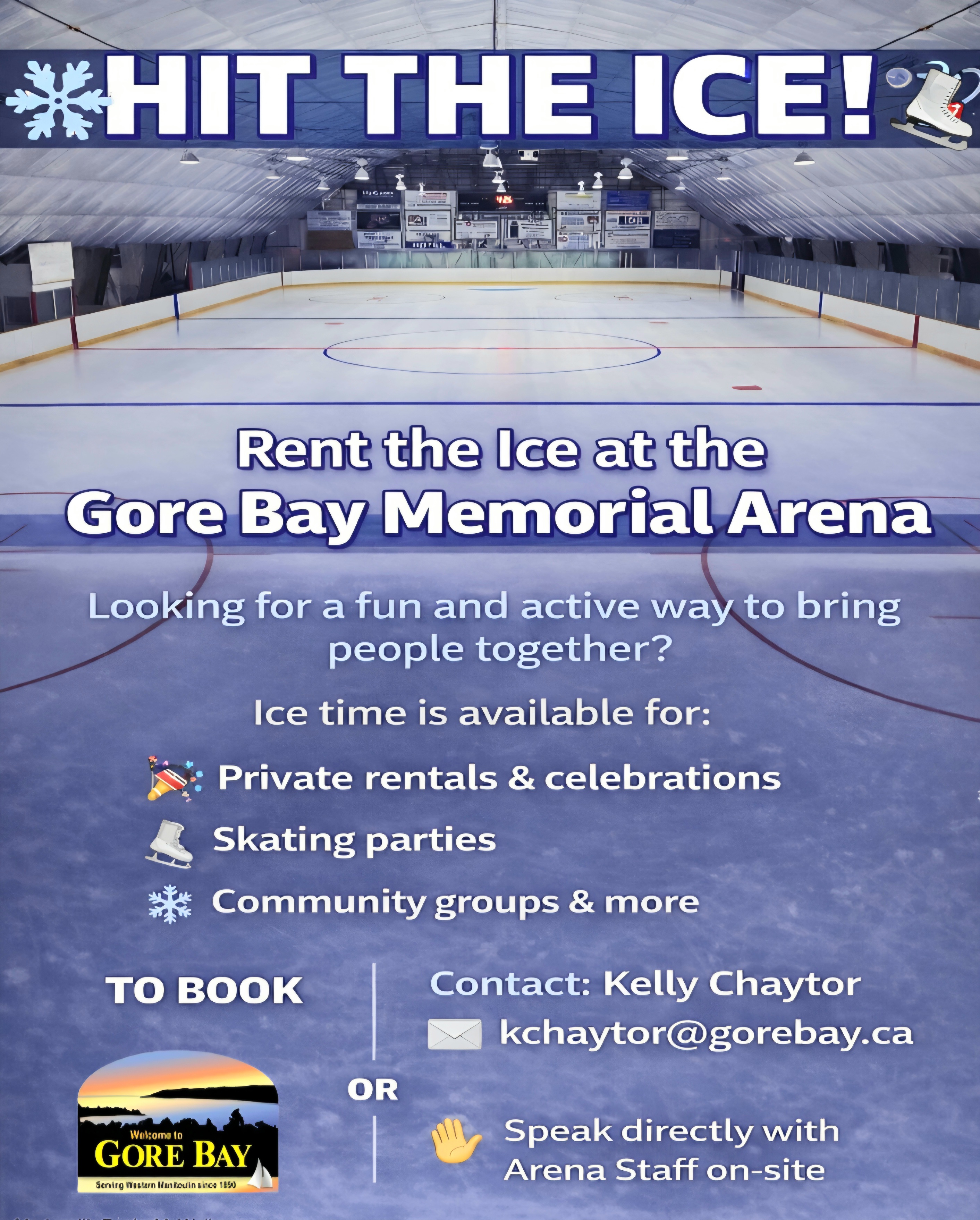 Ice rental opportunities are available at the Gore Bay Memorial Arena.
