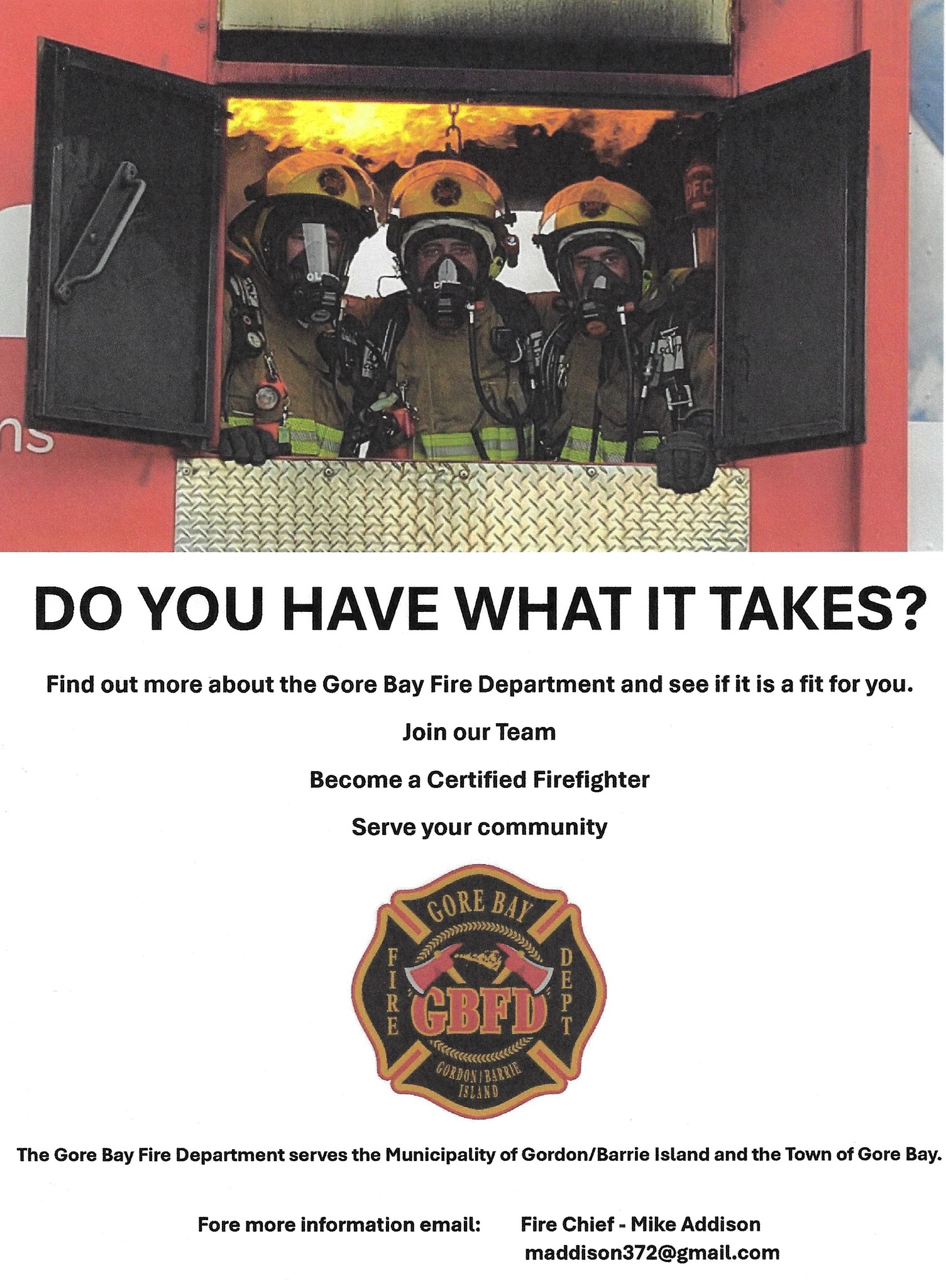 The Gore Bay Fire Department serves the Municipality of Gordon/Barrie Island and the Town of Gore Bay and is seeking individuals who want to serve their community and join a dedicated team. Training provided.