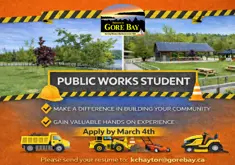 Public Works Student assists the Public Works crew with daily operations throughout the Town of Gore Bay. Duties include supporting road and sidewalk maintenance, parks and property upkeep, waste services, equipment maintenance, and general labour tasks as assigned. The student will work as part of a team to help maintain safe, clean, and well-maintained public spaces while providing reliable and professional service to the community.