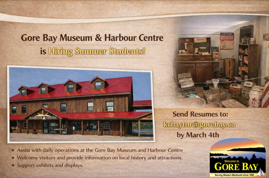 The Museum & Harbour Centre Student will assist with daily operations at the Gore Bay Museum and Harbour Centre. This role involves welcoming visitors, providing information on local history and attractions, supporting exhibits and displays, and helping maintain a clean, safe, and organized facility.